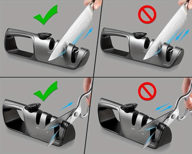 • Prilagodljiv ročaj: omogoča nastavitev kota ostrenja od 14° do 24° na stran, kar omogoča ostrenje različnih vrst nožev, kot so noži za filetiranje, azijski noži, standardni kuhinjski noži, lovski noži in sekači.