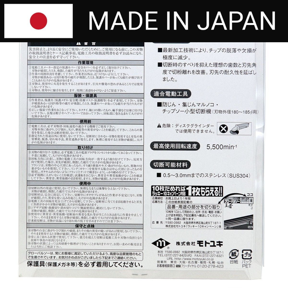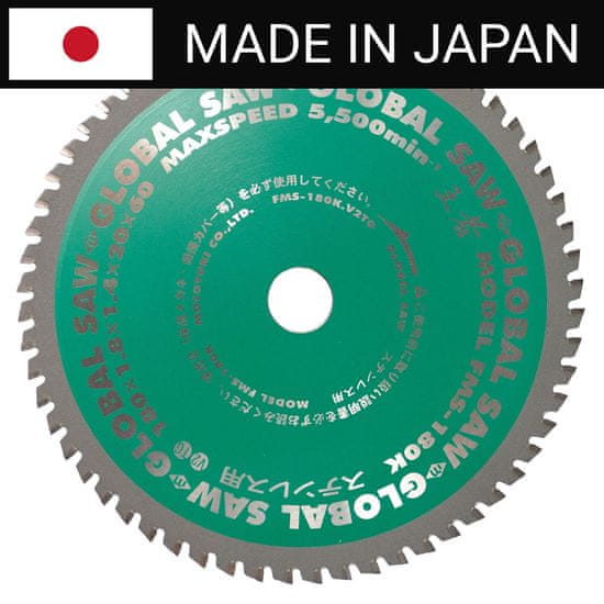 GLOBAL SAW krožni žagin list za rezanje nerjavečega jekla 180 × 1,8/1,4 × 20 mm / 60z CERMET, ki ga proizvaja japonsko podjetje Motoyuki , eno vodilnih podjetij v proizvodnji najkakovostnejših diskov z cermetno-karbidnimi zobmi.