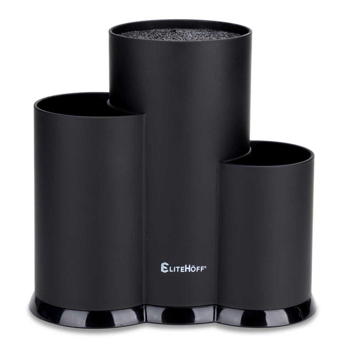 Trojno stojalo za nože in kuhinjske pripomočke. Blok je napolnjen s plastičnimi palicami. Zahvaljujoč temu lahko shranjujete nože različnih debelin, širin in dolžin. Preostala 2 predelka lahko prosto uporabljate za kuhinjske pripomočke in pripomočke. – Sodoben dizajn – Zasnovano za shranjevanje vseh vrst kuhinjskih nožev, katerih dolžina ne presega 6" – Prihranek prostora – Trdno podnožje zagotavlja stabilnost stojala – Plastično ohišje – Polnilo v obliki odstranljivih in pralnih plastičnih palic – Mere bloka nožev: 11 × 22 cm – Mere celotnega stojala: 23 × 22 × 10 cm – Barva: črna