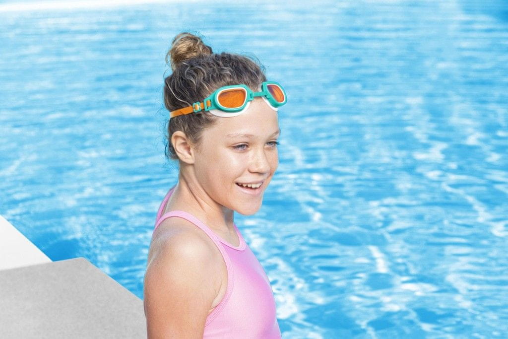 Moderna plavalna očala z varnostnimi lečami. Udobne oblikovane očesne čašice za popolno prileganje. Nastavljiv trak za varno in udobno prileganje. Za otroke, stare 7 let in več.