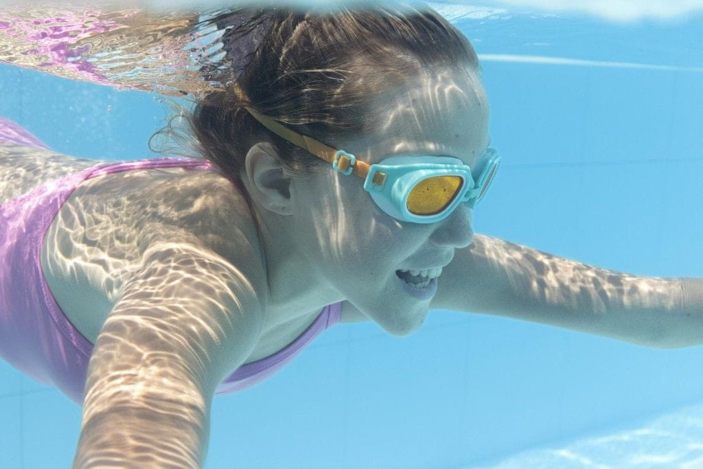 Sodobna plavalna očala z varnostnimi lečami. Celoten opis