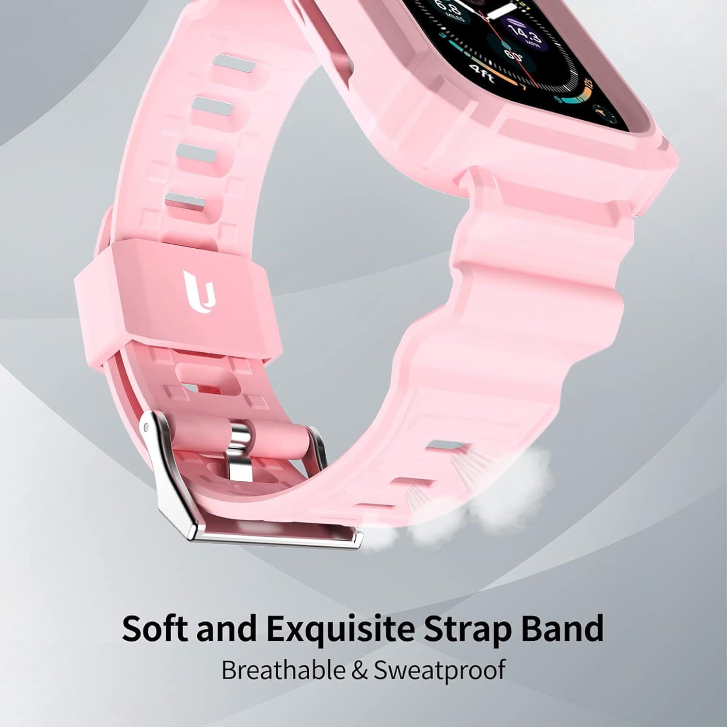 • Popolnoma zavito, odporno na udarce:Ta nadomestni pas za pametno uro ima edinstven integriran dizajn. Pas uporablja visokokakovosten, mehak, upogljiv TPU, zaščitni pokrov pa ima vgrajen vzdržljiv odbijač za računalnik, ki zagotavlja dvojno zaščito za vašo Apple Watch. Dvignjeni okvirji zagotavljajo dodatno zaščito zaslona, ​​zaradi česar je vaša Apple Watch odporna na nenamerne udarce in padce.
