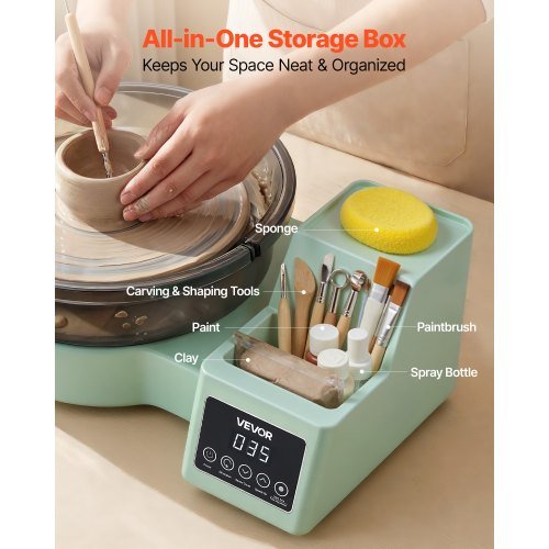 Ustvarjajte keramiko doma z električnim lončarskim kolesom, ki ima robustno aluminijasto vrtljivo ploščo in nastavljivo hitrost za gladko oblikovanje. Idealno za začetnike in ljubitelje, ponuja kompakten namizni dizajn in integrirano shrambo za enostavno organizirano ustvarjanje. Celoten opis