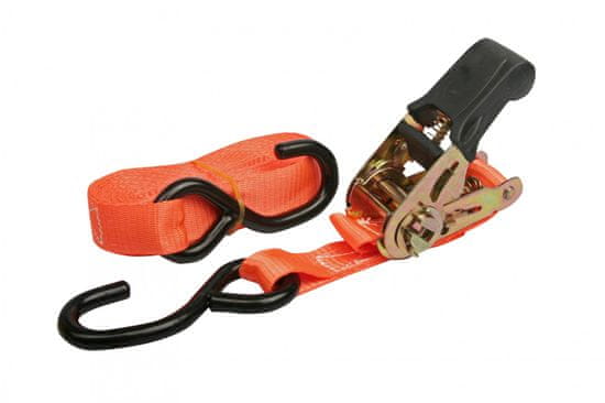 Opis: Dvodelni trak z zaskočnico za pritrjevanje tovora, zaključen z enim kavljem. Ročaj je v celoti kovinski z mehanizmom za zaklepanje, 25 mm širok pas, dolg 5 m. Natezna trdnost vpenjalnega traku je 300 kg, nosilnost 600 kg. Pri vpenjanju bremena priporočamo uporabo zaščitnih elementov. Brez uporabe zaščitnih elementov se lahko vpenjalni jermen poškoduje. Če je vpenjalni jermen poškodovan, ga ne uporabljajte! Za dvigovanje bremen je prepovedano uporabljati vpenjalne jermene. Zapenjalnih jermenov, ki so vozlani, vozlani ali kako drugače nestrokovno spremenjeni, se ne sme uporabljati.