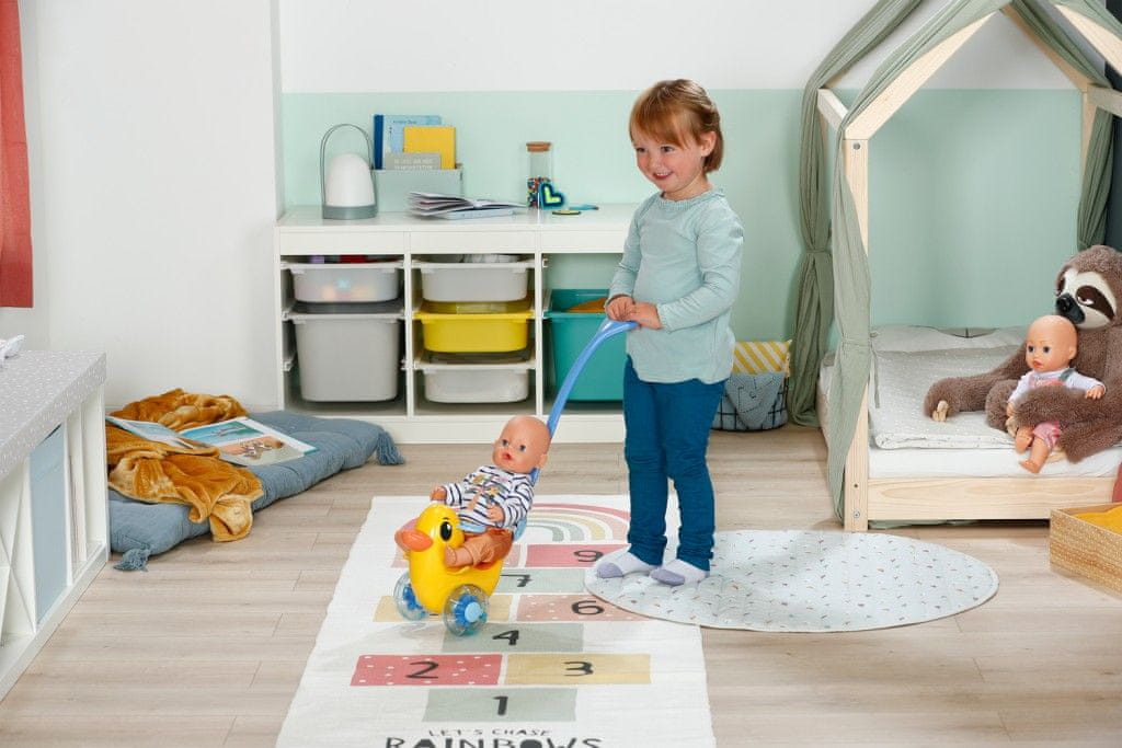 BABY born Berta otroški voziček z nastavljivim naslonjalom in odstranljivo vodilno palico. – Z odstranljivo in nastavljivo vodilno palico. – Prozorna modra kolesa so napolnjena s kroglicami. – Primeren za vse. – Pod sedežem je skrit skrivni predalček za majhne zaklade. – Kakovosten pripomoček za veselje do domišljijske, raznolike in dolgotrajne igre.