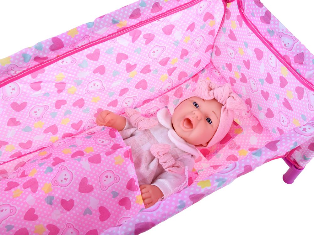 ležišče z blazino in odejo + prevleko za ležiščekolesce s torbostol za hranjenjeKomplet ne vključuje lutke.