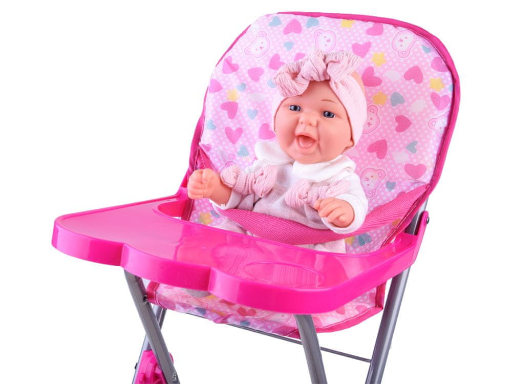 Komplet je izdelan zelo estetsko in učinkovito, konstrukcija vozička in otroške posteljice je izdelana iz plastičnih cevi, konstrukcija stola pa iz kovinskih cevi in plastičnih elementov. Komplet je oblazinjen v rožnato tkanino z grafikami medvedjih obrazov in srčkov.