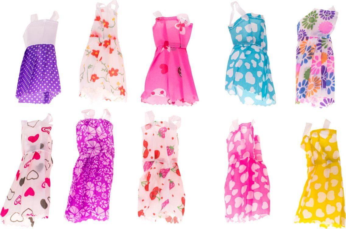 Komplet vsebuje: 10 kosov oblek za lutke (dolžina 13 cm), čevlje, torbice, krone itd.