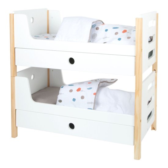 Lepa voda po britju! Navdušil vas bo s svojo funkcionalnostjo in skandinavskim dizajnom, zaradi katerega se lepo poda v vsako otroško sobo. Je sodobna, obojestranska, ima spolno nevtralno posteljnino in prevelike odeje, ki lepo uspavajo lutke in plišaste živali do 46 cm. Postelji lahko zlagate v vrsto in tako na eni strani ustvarite lestev. Predali pod vsako od postelj so kot nalašč za shranjevanje dodatkov za lutke. Visokokakovostna, stabilna konstrukcija, zaobljeni robovi, vidno izdelani iz lesa… Popolna igrača za vsako otroško sobo. GlavneznačilnostiMožnost uporabe kot enojne ali pogradne posteljePredali za shranjevanje dodatkov za lutkeNevtralna posteljnina za oba spolaPredalčkane odejeZaobljeni robovi, vidno iz lesaZa lutke in plišaste živali do 46 cmSkandinavsko linearno oblikovanje Little Button Linija privlačnih dodatkov za lutke Little Button ponuja različne izdelke, od vozička do stolčka in garderobne omare. Na kupce zlahka naredi vtis enotno, funkcionalno in umirjeno oblikovanje z ravnimi linijami in treznimi nevtralnimi barvami. To jim omogoča, da skupaj ustvarijo skladne, harmonične komplete, ki okusno dopolnjujejo sodobno notranjost. Prefinjena konstrukcija in kakovostna izdelava pomagata zagotoviti visoko stabilnost, varnost in trajnost. Z njimi ustvarite eleganten kotiček za lutke, v katerem lahko vaši otroci razvijajo domišljijo in skrbstvene spretnosti.