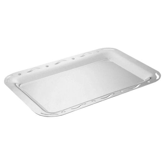 Prefinjen pladenj pravokotne oblike je izdelan iz kakovostnega poliranega nerjavečega jekla 18/10, ki združuje vzdržljivost s brezčasno eleganco. Rob krasi subtilen perforiran vzorec, ki dodaja pridih prefinjenosti in klasičnega šarma. Z dimenzijami 38 × 27 cm je idealen za postrežbo različnih jedi – od predjedi do sladic in svečanih pogostitev. Primeren je za pomivanje v pomivalnem stroju, kar omogoča enostavno in praktično čiščenje. Popolna izbira za domačo uporabo ali profesionalno gostinstvo.