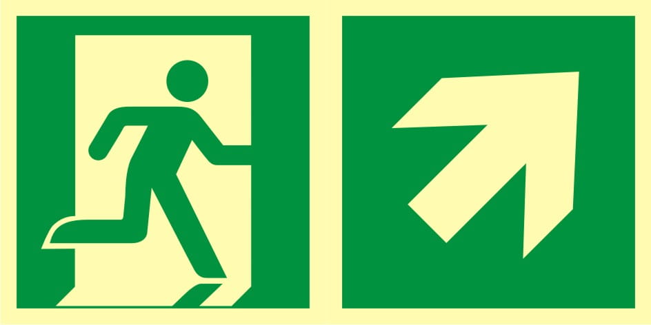 Znak za evakuacijo: Smer do zasilnega izhoda navzgor desnoZnak za evakuacijo: Smer do zasilnega izhoda navzgor desno je znak, ki obvešča o evakuacijski poti. Označuje pot, po kateri je treba iti med evakuacijo. Znak „Smer do zasilnega izhoda navzgor“ je certificiran s strani CNBOP 4532/2022 in je zato skladen z veljavnimi standardi. V skladu s tem znakom se morate povzpeti (po stopnicah) in nato zaviti desno. Znak za evakuacijo: Smer do zasilnega izhoda navzgor desno je na voljo v več različicah. Izdelana je iz naslednjih materialov: • Trda fotoluminiscenčna plošča • Samolepilna fotoluminiscenčna folija • Fotoluminiscenčna TD plošča • Fotoluminiscenčna talna folija Tabla »Smer do zasilnega izhoda navzgor desno« ima zeleno ozadje, piktogram in okvir pa sta vidna v temi. Lahko ima naslednje dimenzije: • 20 × 10 cm • 30 × 15 cm • 40 × 20 cm • 60 × 30 cm • 80 × 40 cm • 100 × 50 cm