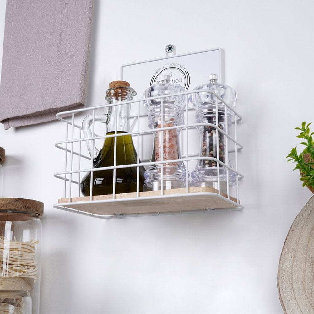 Univerzalna kuhinjska polica za shranjevanje začimb, zelišč ali drugih kuhinjskih pripomočkov. Če jo obesite na steno, bo edinstven dekorativni element. Trdno izdelana. Kombinacija bele in lesa se bo odlično dopolnjevala z vsako kuhinjsko opremo. Izdelano v skladu z evropskimi standardi.