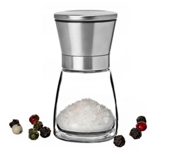 Ročni mlinček za sol, poper in začimbe. Ta mlinček za začimbe je izdelan iz nerjavečega jekla in ima prozorno stekleno steno, ki vam omogoča spremljanje nivoja vsebine v posodi. Mlinček ima keramični mehanizem za mletje, ki vam omogoča nastavitev stopnje mletja soli, popra ali drugih začimb. Zakaj se splača imeti? Stopnjo mletja (grobost) je mogoče nastaviti. Visokokakovostna izdelava zagotavlja dolgoletno uporabo. Klasični in elegantni videz mlinčka je primeren za različne notranje opreme. Njegova priročna velikost se popolnoma prilega roki. Keramični mehanizem za mletje zagotavlja vzdržljivost in trdnost izdelka. Parametri: Znamka: Galicja Material: Steklo, nerjaveče jeklo Barva: Srebrna/prozorna Prostornina: 190 ml Višina: 13,5 cm Premer: 6,5 cm Nastavljivo mletje: Da Uporaba: Za sol, poper in začimbe