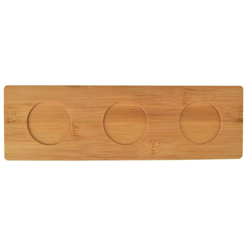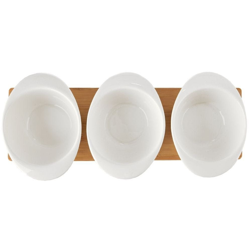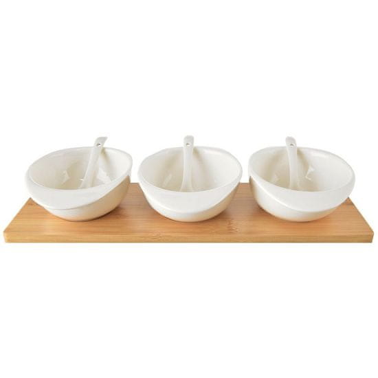 Komplet treh skled z žlicami na bambusovem pladnju. Uporabite jih za serviranje prigrizkov, predjedi, omak in pomak. Komplet je na mizi videti čudovito. Postrežene omake ali predjedi so priročno postavljene na enem mestu, zaradi česar jih je enostavno prenašati. Sklede so odlične za družinska praznovanja in druženja s prijatelji. Uporabne so tudi za serviranje omak med žari. Komplet je primeren tako za domačo kot za profesionalno uporabo. Odlična ideja za darilo, na primer za vselitev. Originalen izdelek češke blagovne znamke Orion. Izdelano v skladu z evropskimi standardi.
