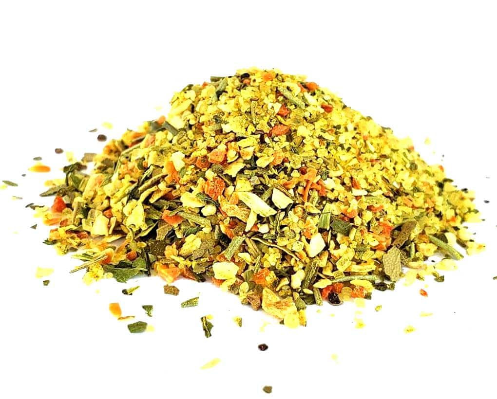 Sestavine: sol, sladkor, korenje, čebula, koruza, rožmarin, pastinak, črni poper, peteršilj, piment, lovorjev list, lovorjev list, kurkuma, por, kurkumin oleoresin.