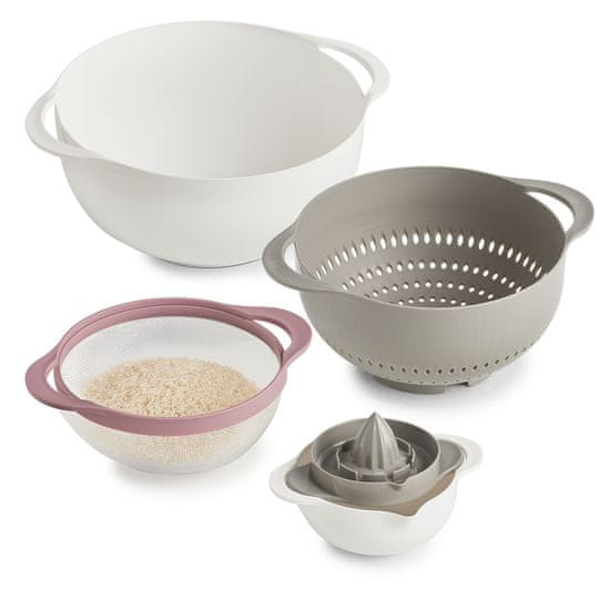 Večnamenski kuhinjski set, 5 kosov, plastika, belo-sivo-jagodno, Ø12×7 Ø15×7,5 Ø18,5×8 Ø22×12 Ø26×12,5 Celoten opis
