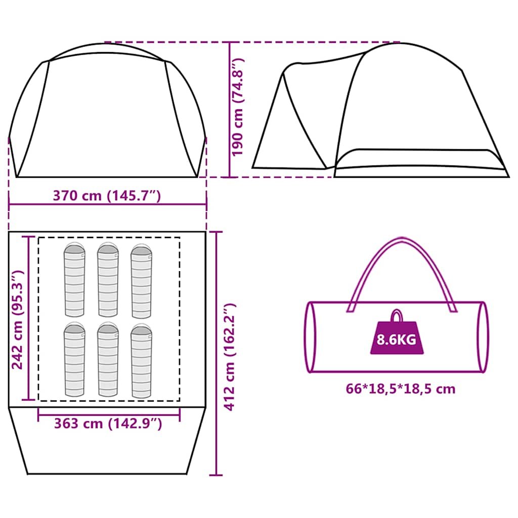 • Notranje dimenzije šotora: 242 × 363 × 184 cm (D x Š x V)