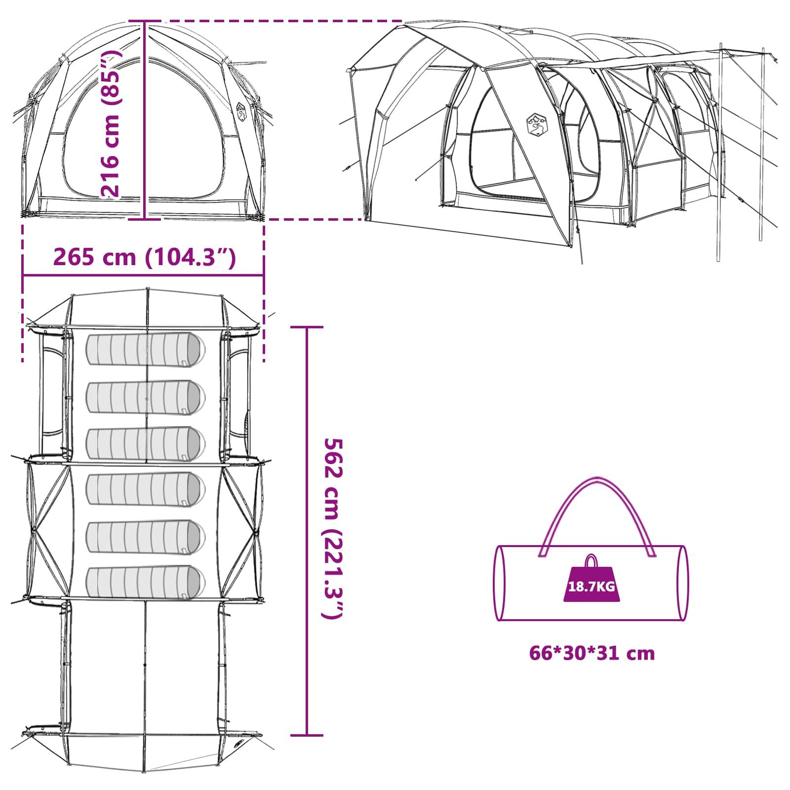 Ta tunelna šotora združuje sodoben dizajn in praktičnost, narejena iz 185T poliestra s PU premazom in trpežnega jekla. Njen eleganten tunelski izgled ponuja osvobajajoče kampiranje, ki uporabnikom omogoča, da uživajo v naravi brez žrtvovanja udobja. Prostorna šotora je odlična za družine ali skup Celoten opis