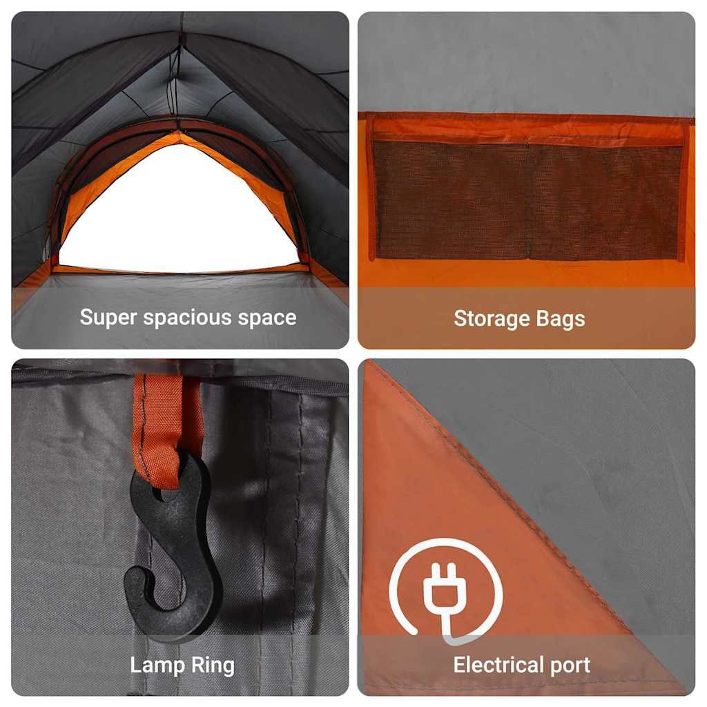 • Funkcionalne komponente: Ta šotor prinaša sodobne udobnosti z E-vtičnico in visečo kljukico. E-vtičnica omogoča enostavno uporabo elektronskih naprav, medtem ko viseča kljukica nudi praktično rešitev za osvetlitev vašega prostora ob mraku. Ti dodatki so zasnovani za izboljšanje vaše kamping izkušnje.