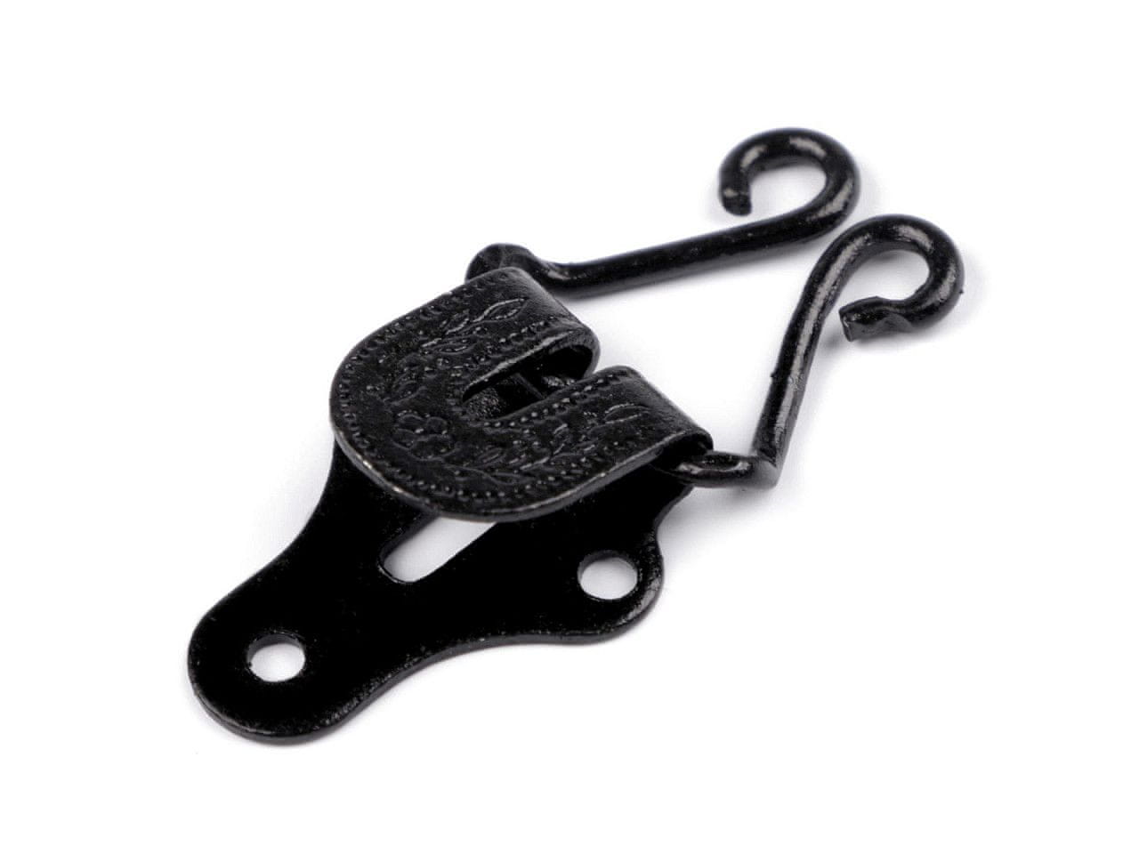 Kovinska kljuka je okrašena z graviranim vzorcem. Sestavljena je iz dveh delov – kavlja in nasprotnega kavlja z očesci. Kljuka se uporablja kot zaponka na oblačilih, na primer moških in ženskih hlačah ali krilih. Uporabite jo lahko tudi na majicah, telovnikih ali bluzah.