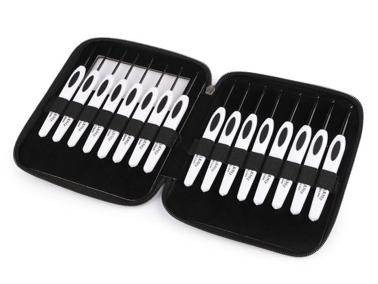 Set kavljev za kvačkanje je pakiran v etui, ki ga lahko preprosto zaprete z zadrgo. Kljuke imajo ekskluzivno črno lakirano površino. Notranjost etuija je žametna. Komplet vsebuje 16 trnkov naslednjih velikosti: 1; 1,25; 1,5; 1,75; 2; 2,25; 2× 2,5; 2,75; 3; 3,5; 4; 4,5; 5; 5,5; 6 mm.