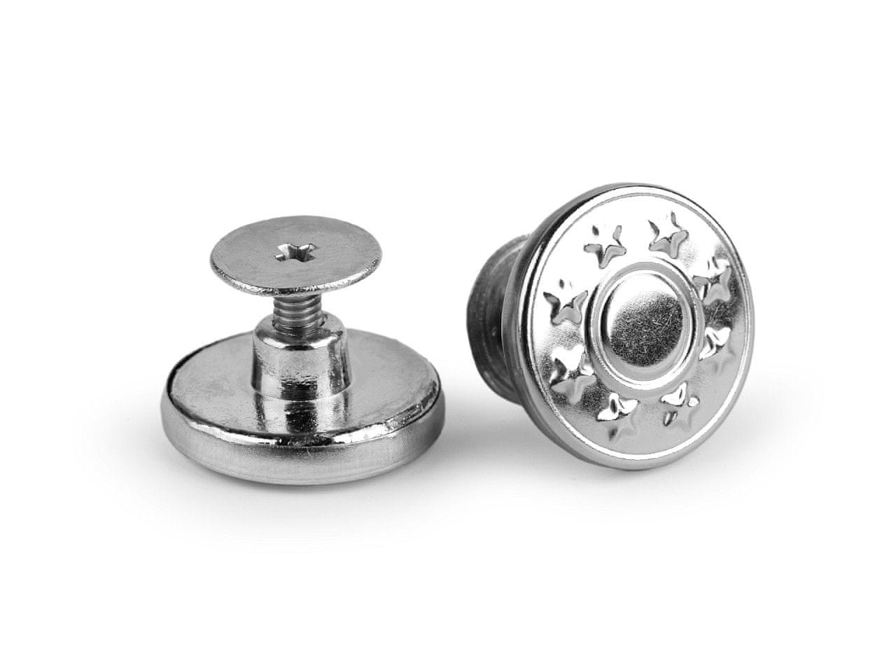 Kovinski gumb za džinse je izjemen, saj se ne udarja, temveč se privijači, kar vam prihrani delo in čas. Za uporabo ne potrebujete nobenega dodatnega orodja. Sestavljen je iz dveh delov – samega gumba in vijačne zakovice. Gumbi bodo izstopali na kavbojkah, jaknah iz džinsa, telovnikih, oblekah itd. Dolžina zakovice je 4 mm. Velikost gumbov najdete v tej tabeli.