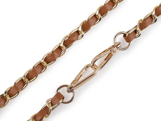 Kovinska verižica je učinkovito prepletena s trakom iz eko usnja. Uporabite jo za manjše torbice, denarnice ali etuije za mobilne telefone. Na obeh koncih so pritrjeni karabinčki. Verižica ni namenjena težkim bremenom.