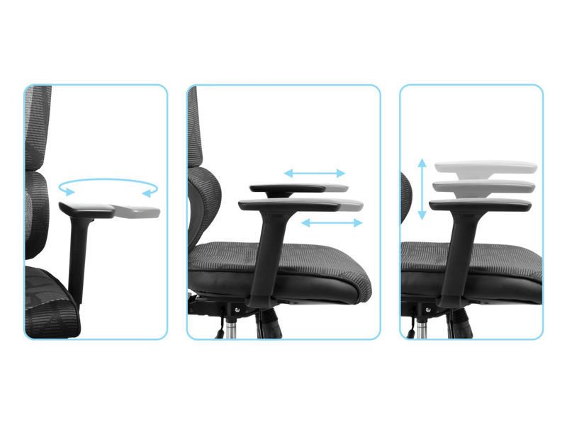 • Nastavitve: višina sedeža, globina sedeža, naklon naslonjala (4 položaji), 3D nastavljivi nasloni za roke in glavo