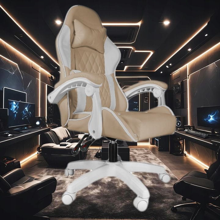 PISARNA IN IGRALNA „PRESTIGE“ – BEŽ – BELA Fotelj PRESTIGE FG-PRS-017 je zasnovan za ljudi, ki cenijo nekonvencionalen in edinstven dizajn, ročno izdelan in okrašen fotelj ter njegove elemente. Fotelj PRESTIGE ne zagotavlja le udobja med dolgim igranjem iger, temveč se odlično obnese tudi med večurnim delom za računalnikom. Ta model združuje številne preizkušene rešitve, kot je mehanizem, ki omogoča gladko nastavitev naklona hrbtišča, in edinstven ter eleganten dizajn. Izdelan je iz eko usnja in sestavljen iz številnih prefinjenih detajlov, kjer je želeni končni rezultat najvišje možno udobje uporabnika. Fotelj PRESTIGE združuje praktičnost visokokakovostnega materiala v kombinaciji z originalnimi, nenavadnimi barvami in originalnimi detajli, kot sta ledvena blazina v posebej zasnovanem vzorcu ter prešita sedež in hrbtišče. Celota je izdelana iz preizkušenih materialov, ki zagotavljajo najvišje udobje uporabe. Kolesa, prevlečena s poliuretansko-gumijasto prevleko, zagotavljajo stabilnost ter tiho in varno delovanje na kateri koli površini. Komplet vključuje orodje, potrebno za sestavljanje stola, celoten postopek je zelo preprost in intuitiven. Poleg tega so v embalaži slikovna navodila. Zaradi svoje zasnove bo izdelek dobro deloval tako v igralčevi sobi kot v pisarni. OPOMBA! Zaradi individualnih nastavitev monitorja se lahko dejanska barva materiala nekoliko razlikuje od prikazane na sliki. OPOMBA! Izdelek morate sestaviti sami. Vsi potrebni deli in orodje so priloženi kompletu. PREDSTAVITEV STOLA GLAVNE LASTNOSTI IZDELKA ✔️ VISOKA KAKOVOST ✔️ NATANČNA IZDELAVA ✔️ NASTAVLJIVO HRBTNO NASLO ✔️ MODEREN VIDEZ ✔️ Ergonomski igralni stol z školjkastim sedežem ✔️ Udobni, mehki nasloni za roke ✔️ Originalna zasnova stola ✔️ DVE VZGLAVNICI ✔️ VRTENJE ZA 360° ✔️ NAGON HRBTNEGA NASLONA ZA 135° ✔️ LEDVENA VZGLAVNA Z MASAŽO Polnjena z najkakovostnejšo termoelastično gobo Airbase ✔️ Petzvezdično močno podnožje TechPro Nylon 5.1 ✔️ Dvigalo s plinskim dvigalom s certifikatom SGS ✔️ Dve nastavljivi blazini: ledvena in vratna ✔️ Debelina sedeža – 10 cm ✔️ POMAGA VZDRŽEVATI ZDRAV POLOŽAJ ✔️ Stol je zasnovan tako, da skrbi za pravilno pozicioniranje hrbta ✔️ Gladka nastavitev višine sedeža ✔️ Funkcija, ki omogoča gladko nastavitev hrbtnega naslonjala stola ✔️ Kolesa prevlečena s poliuretansko-gumiranim premazom – NE OPRASKAJO TLA ✔️ Največja teža uporabnika: 120 kg Funkcija gladke nastavitve kota hrbtnega naslonjala z ročico, ki se nahaja pod hrbtnim naslonjalom, je preizkušena rešitev, ki vam omogoča da izberete najbolj udoben položaj za več ur dela ali zabave. Z enim samim gibom roke se lahko odločite, ali se želite osredotočiti na delo ali se čim bolj sprostiti – preprosto uporabite ročico pod sedežem. POZOR! Ilustrativna fotografija prikazuje le parametre nastavitve naslonjala, barva stola je bila izbrana naključno, funkcije stola so enake za vse naše stole. OHRANITE UDOBEN IN ZDRAV POLOŽAJ Stol ima nastavljivo višino sedeža in kot naslonjala, kar vam omogoča doseganje najvišje ravni udobja. Ta funkcija ponuja številne prednosti, vključno z izboljšano držo in boljšo koncentracijo med igro. Zahvaljujoč posebej zasnovani obliki naslonjala ima stol tudi oporo za hrbtenico. Nastavljivo naslonjalo igralcem omogoča preklapljanje med sedečim in ležečim položajem, kar omogoča razbremenitev vratu in hrbta. DVE VZGLAVNICI Stol je opremljen z dvema dodatnima blazinama: ledveno in vzglavno, ✔️ Izberite igralni stol z udobnimi blazinami z masažerjem in stabilno podlago! ✔️ Ledvena blazina s posebej zasnovanim vzorcem Doživite novo raven udobja z našim novim igralnim stolom, opremljenim z ledveno masažo! Blazine učinkovito razbremenijo vratno in ledveno hrbtenico ter zagotavljajo dodatno udobje med sedenjem. Ta inovativen stol je edinstven zaradi posebej zasnovane blazine z vgrajenim masažerjem, ki skrbi za vaše zdravje in udobje. Med dolgimi sejami za računalnikom občutite olajšanje, ki ga prinaša ledvena masaža. Posebej zasnovana ledvena blazina v kombinaciji z oblikovano obliko naslonjala zagotavlja, da je hrbtenica vedno v pravilnem položaju. Naš igralni stol z masažerjem v blazini je idealna rešitev za igralce, ki cenijo udobje in odlično oporo za hrbtenico. Zahvaljujoč edinstvenemu sistemu trakov „klik“ so blazine stabilne in jih je enostavno nastaviti. Nastavite jih lahko na pravo višino zase, da zagotovite največje udobje. Zaradi te funkcionalnosti stol zagotavlja največje udobje uporabe. LEDVENA BLAZINA S POSEBEJ OBLIKOVANIM VZORCEM Z MASAŽNO FUNKCIJO ✔️ Ena od blazin je bila posebej zasnovana v edinstvenem vzorcu in opremljena z masažerjem. ✔️ Ledvena blazina s posebej zasnovanim vzorcem ✔️ Visoka kakovost in pozornost do detajlov SODOBNA IGRALNIŠKA OBLIKOVANJE Sodobna igralniška oblika in vedrasta oblika sedeža po vzoru tistih, ki se uporabljajo v reli avtomobilih, sta izjemno modni. Stol se bo popolnoma prilegal vsaki igralni postavitvi, dobro bo izgledal tudi v delovni sobi ali pisarni. Izdelek bo izpolnil vaša pričakovanja, ne glede na to, ali potrebujete stol za delo, ste nedeljski igralec, streamer ali igrate na veliko višji ravni. ✔️ Pridobite trpežen in enostaven za vzdrževanje stol – izdelan iz trpežnega, gladkega in vodoodpornega materiala ✔️ Ne prekinjajte igre – tiho in varno gibanje zahvaljujoč kolesom Predstavljajte si, da igrate svojo najljubšo igro ponoči, ko večina ljudi že spi, počiva ali gleda televizijo. Uporaba koles, prevlečenih s poliuretansko-gumijasto prevleko pod vašim stolom, vam bo zagotovila popolno udobje in varnost pri gibanju po tleh. Naša kolesa zagotavljajo tiho gibanje, tako da ne boste motili drugih članov gospodinjstva med spanjem. Zato lahko uživate v igri ali delu v popolnem udobju. PRILAGODITE POLOŽAJ SVOJIM 