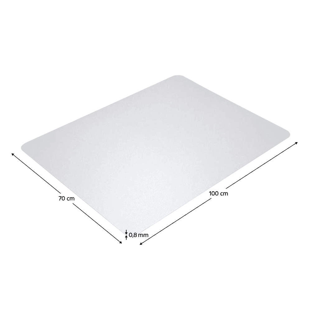 Material: polipropilen Barva: prozorna Dimenzije (ŠxV): 100×70 cm Debelina materiala: 0,8 mm Trajnejši od PVC Primerno za les, laminat, marmor, pluto, kamen, beton Ni primerno za preproge Ni primerno za tla s talnim gretjem zaobljeni robovi Zaščita pred odrgninami in praskami Dobro se meša Celoten opis