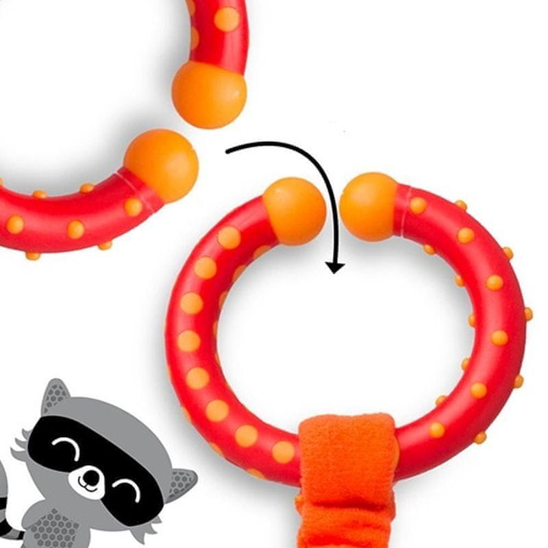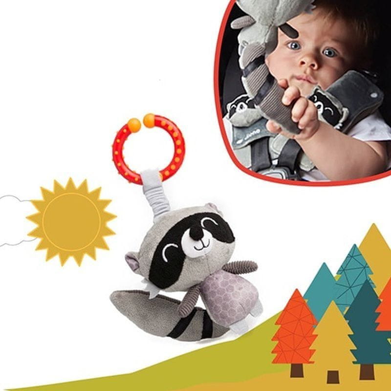 • igrača je izdelana iz različnih materialov in tekstur, ob pritisku piska in jo je mogoče pritrditi na voziček ali avtomobilski sedež s plastičnim obročkom
