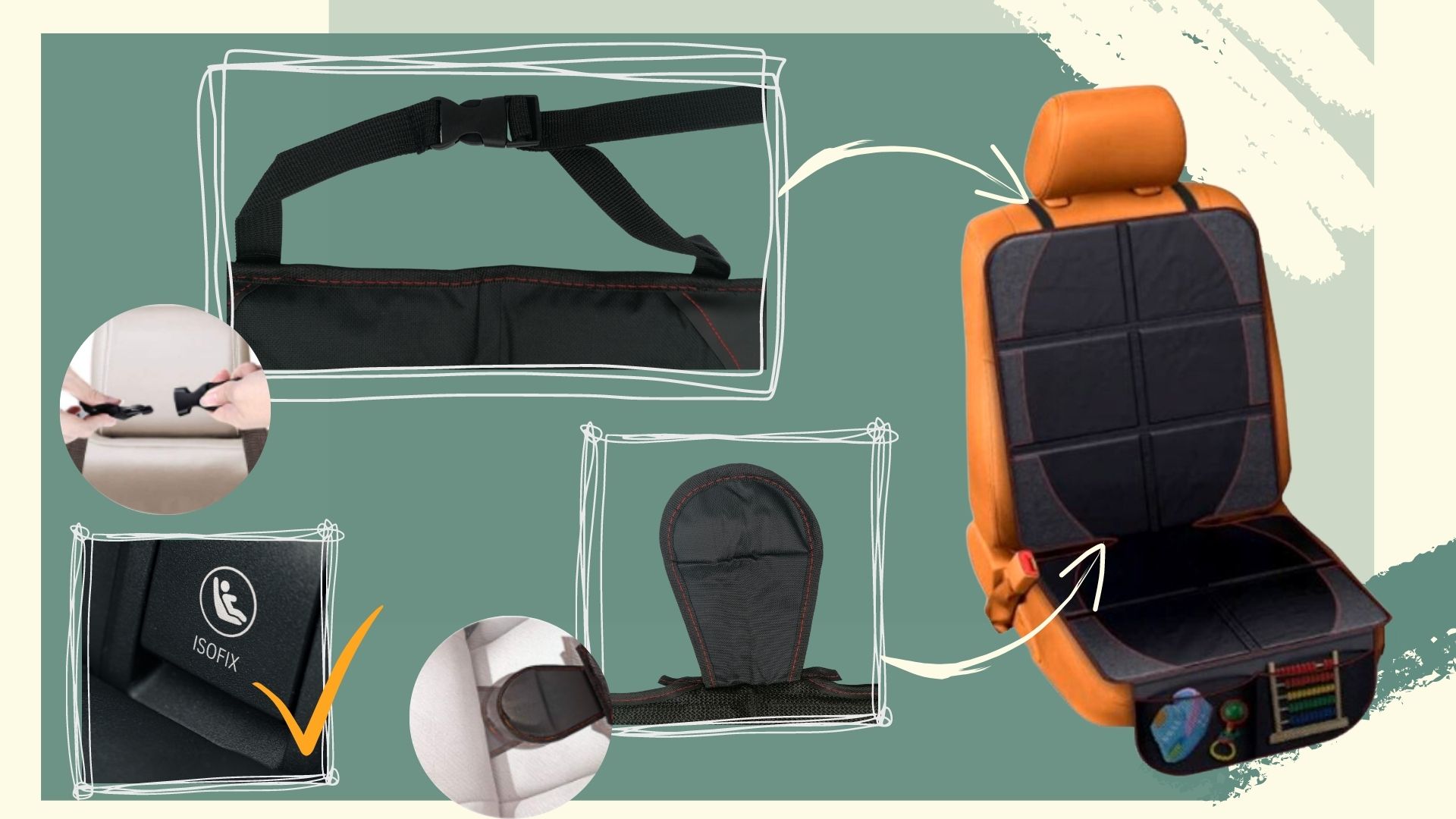 • Poleg pritrditve za vzglavnik ima podloga na notranji strani še dodatno všito pritrdilno element ki ga namestite med sedeži, zahvaljujoč temu vam je zagotovljeno, da se podloga ne bo premaknila