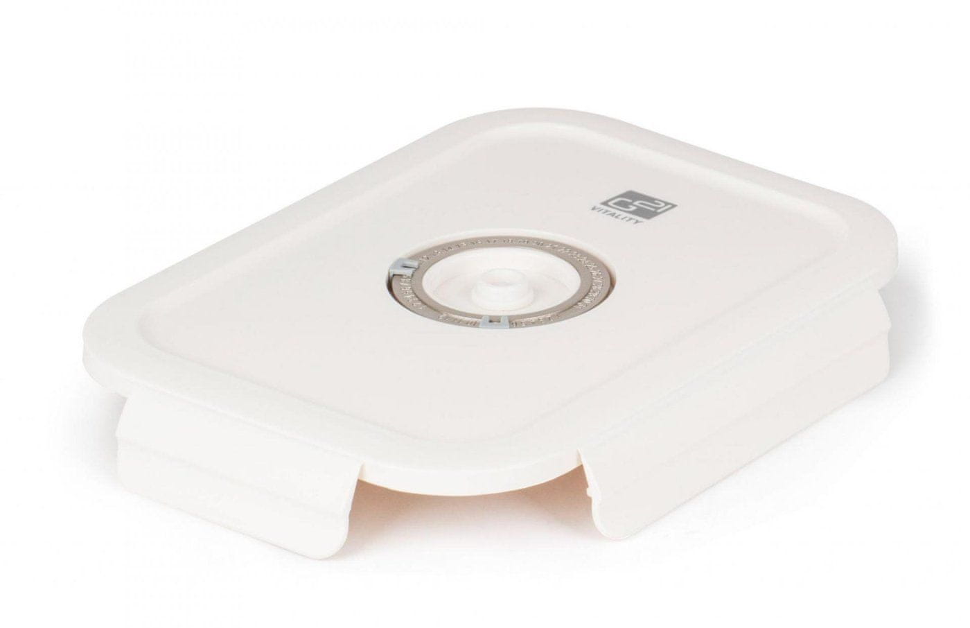 Plastični pokrov je opremljen z vakuumskim ventilom in praktično nastavitvijo datuma. Tako boste vedeli, kdaj je bilo živilo vakuumirano ali do kdaj ga je treba porabiti. Ventil na sredini pokrova lahko nežno stisnete in tako enostavno sprostite vakuum.