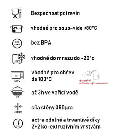 Vakuumske vrečke/Vakuumske vrečke – 30 kosov. Velikost 28 × 35 cm.Vakuumske vrečke in zvitki Maxxo so zelo močni in stabilni, z močnimi utori, ki omogočajo popolno odsesavanje zraka in nepredušno. Celoten opis