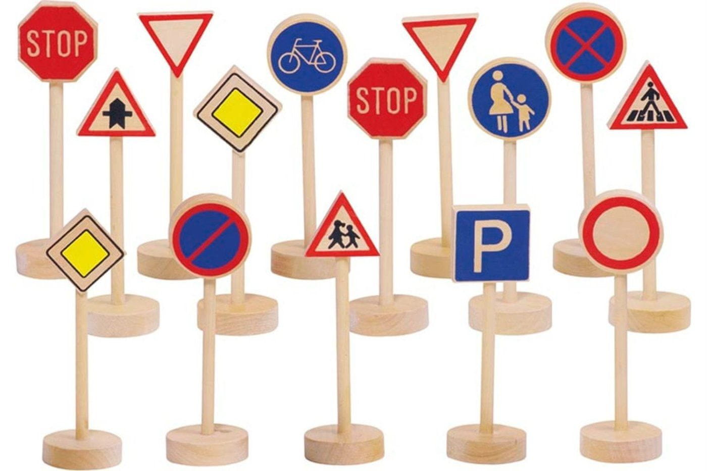 Leseni prometni znaki preprečujejo nesreče pri igri z avtomobili in avtomobilskimi stezami, odličen pripomoček za učenje osnov prometnih pravil, priprava na prihodnji obisk prometnega igrišča, izdelani iz masivnega lesa, uporabljene barve so zdravju neškodljive, enostavni za oprijem, višina znakov: 11 cm, paket vsebuje 15 kosov.