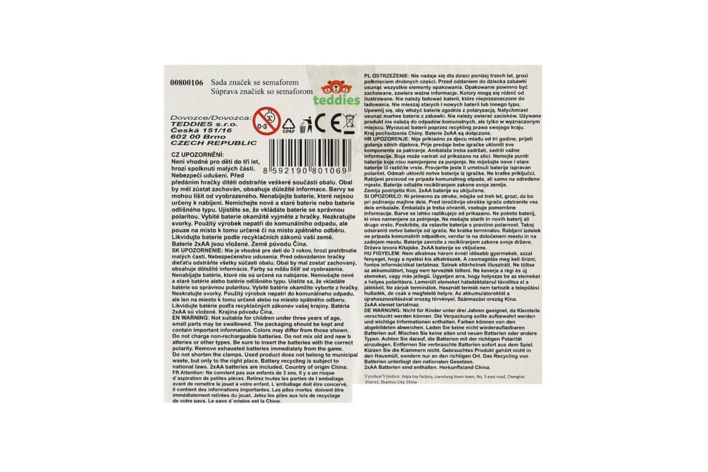 Set semaforjev z oznakami. Semafor ima svetlobne učinke, lahko se uporablja kot izobraževalno orodje pri učenju osnov cestnega prometa. Vključene so 2× baterije AA. Dimenzije paketa 14 × 25 × 9 cm. Primerno za otroke od 3. leta starosti dalje.