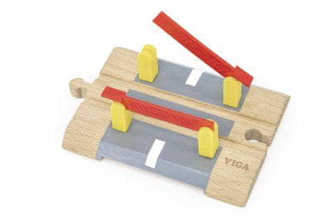 Drevesni prehod z zapornicami. Napajata ga 2 gumbasti bateriji. Na dnu proge so zvočni elementi, ki povzročajo zvok, ko vlak prečka tire. Plastično zaporo je treba ročno dvigniti ali spustiti. Dimenzije paketa 19×14×5,5 cm. Starost 3+
