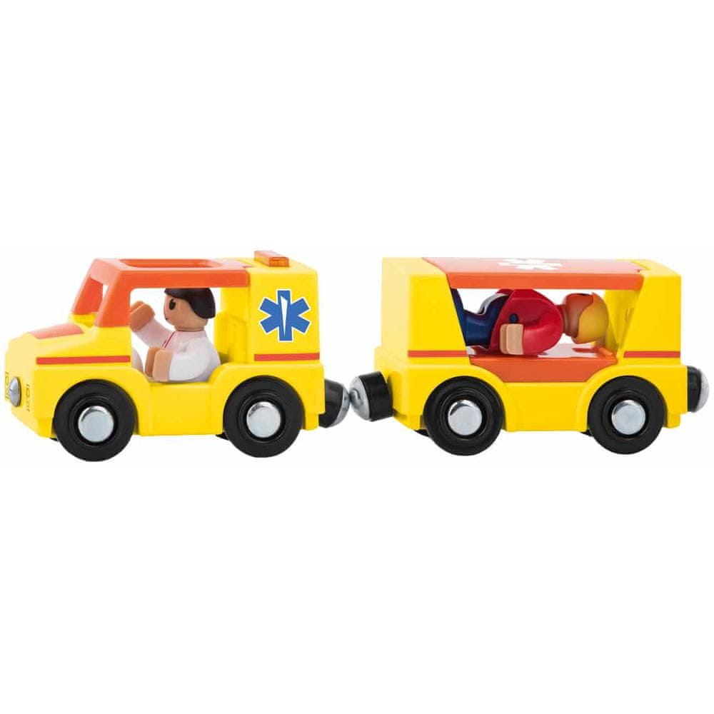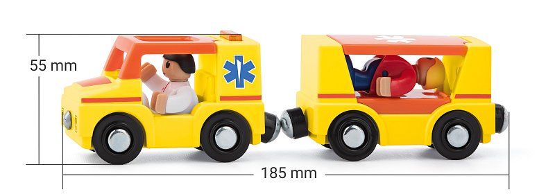 Ambulantno vozilo v barvah čeških reševalnih služb V kompletu s plastičnimi figuricami z gibljivimi sklepi Grafično oblikovanje čeških umetnikov Primerno kot dodatek za vlakovne proge WOODY Združljivo tudi z drugimi vlakovnimi kompozicijami, ki so na voljo na našem trgu