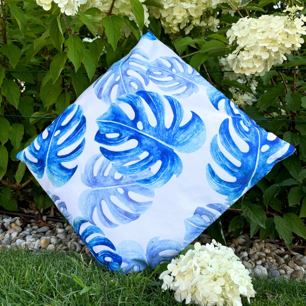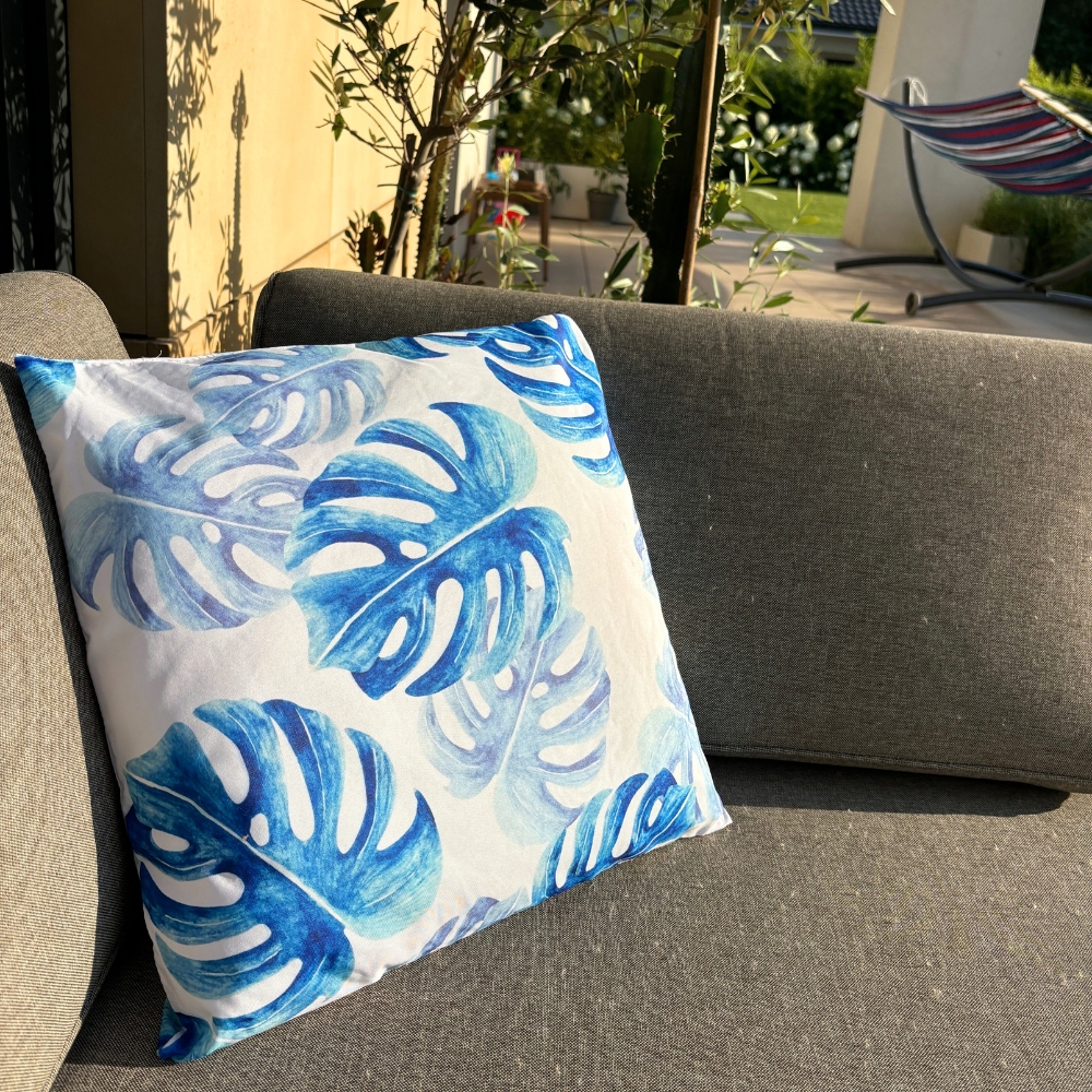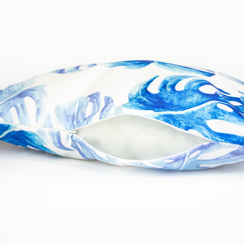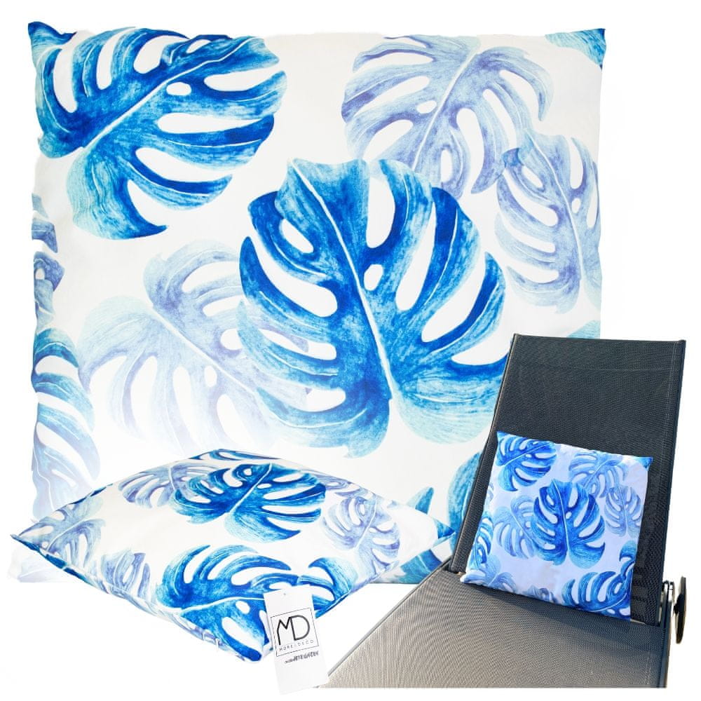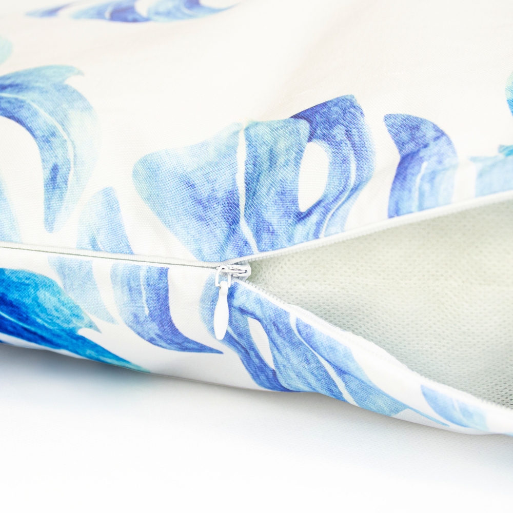 , zato vam ni treba skrbeti za dež ali vlago. Poleg tega UV-filter ščiti tkanino pred bledenjem in zagotavlja njen lep videz dlje časa . ✔️SPECIFIKACIJA material: Oxfordska tkanina (100 % poliester) polnilo: 100 % poliuretan barva: modra, bela motiv: listi monstere zadrga