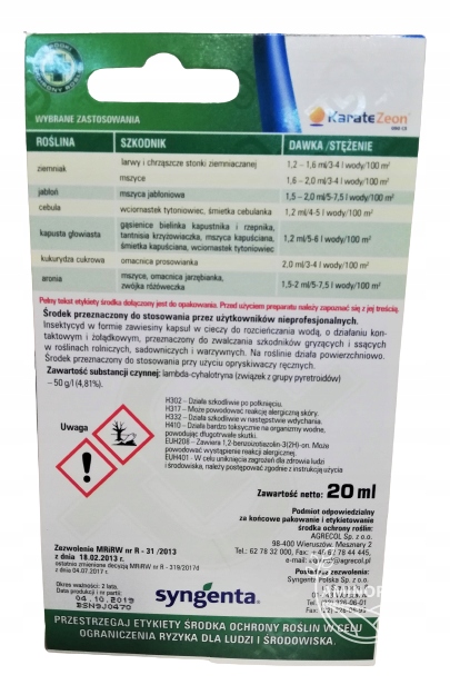 Opis izdelka : Karate Zeon 050 CS je izdelek, namenjen zatiranju grizečih in sesajočih škodljivcev v kmetijskih, sadovnjaških in zelenjavnih rastlinah. Deluje na površini rastlin. Izdelek je namenjen uporabi z ročnimi škropilnicami. Za uporabo s strani nepoklicnih uporabnikov