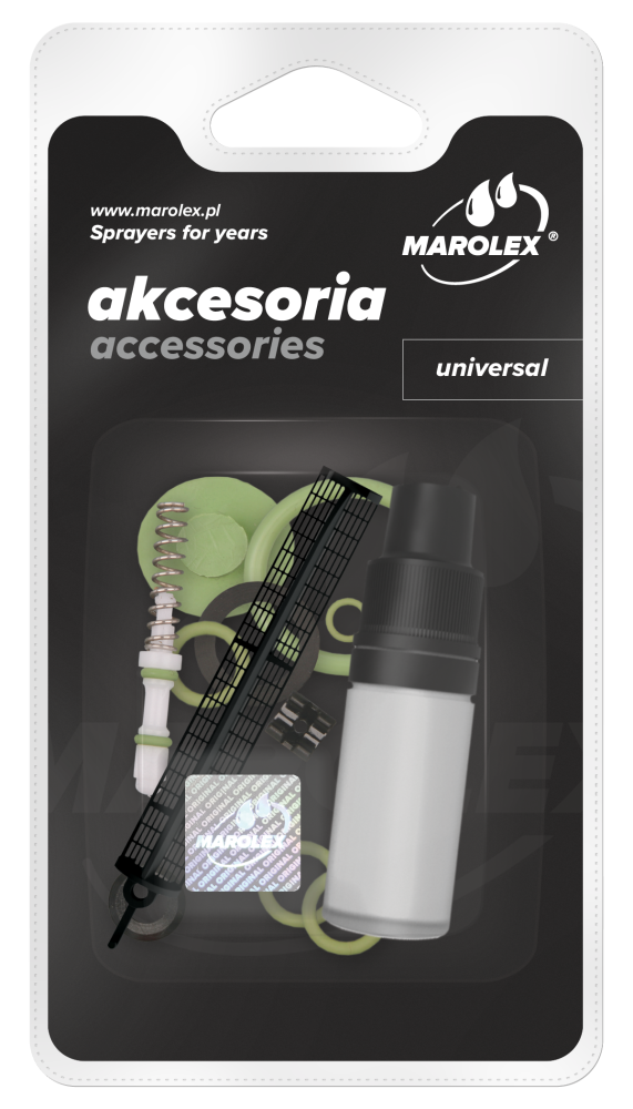 Univerzalni komplet za popravilo industrijskih škropilnic za kislinske cevi Primeren za naslednje modele škropilnic proizvajalca Marolex Komplet vključuje filter R40 bat ventila vpenjalni obroč sponko za sulico R107 vitonski obroč 8×2 vitonski obroč 113×24 silikonsko mast vitonski obroč 3×2 vitonski obroč 28×4 vitonski ventil tesnilo iz vitona 16×24 vzmet dozirnega ventila R48a