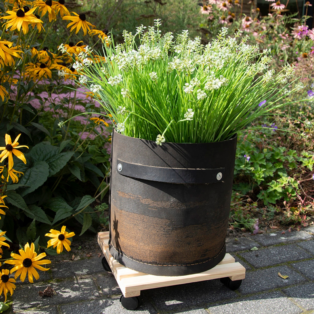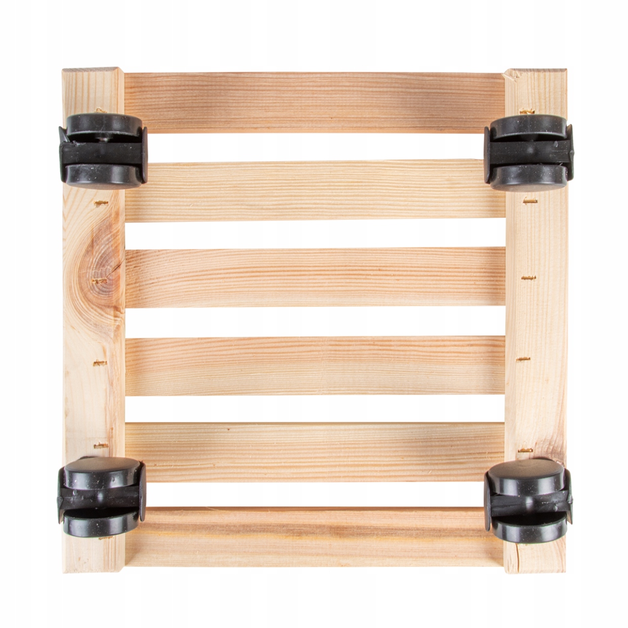 Kvadratno stojalo za cvetlični lonček ali stojalo za rože, opremljeno s 4 kolesi, izdelano iz naravnega borovega lesa s certifikatom FSC. Praktičen voziček za uporabo v zaprtih prostorih, na terasi ali vrtu.