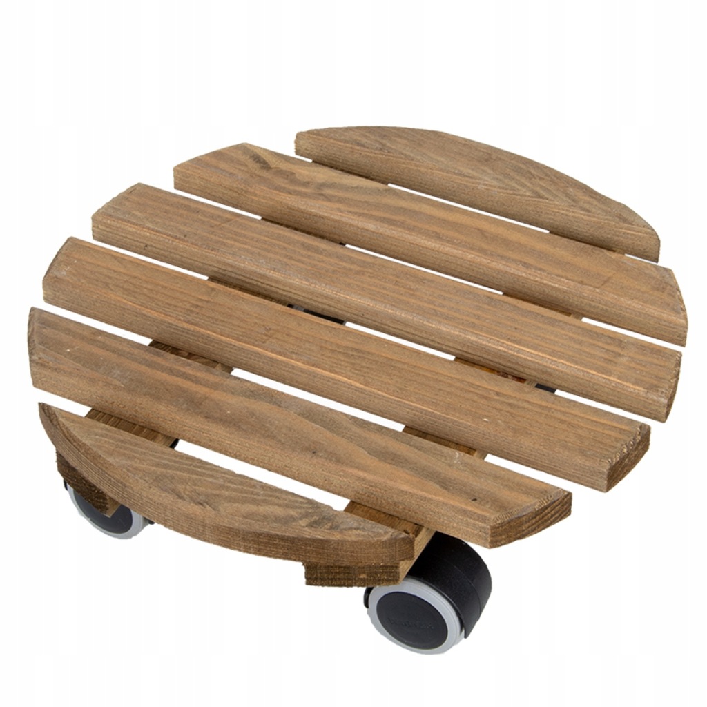Okroglo stojalo za cvetlični lonček ali stojalo za rože, opremljeno s 4 kolesi, izdelano iz naravnega borovega lesa s certifikatom FSC. Praktičen voziček za uporabo v zaprtih prostorih, na terasi ali vrtu.