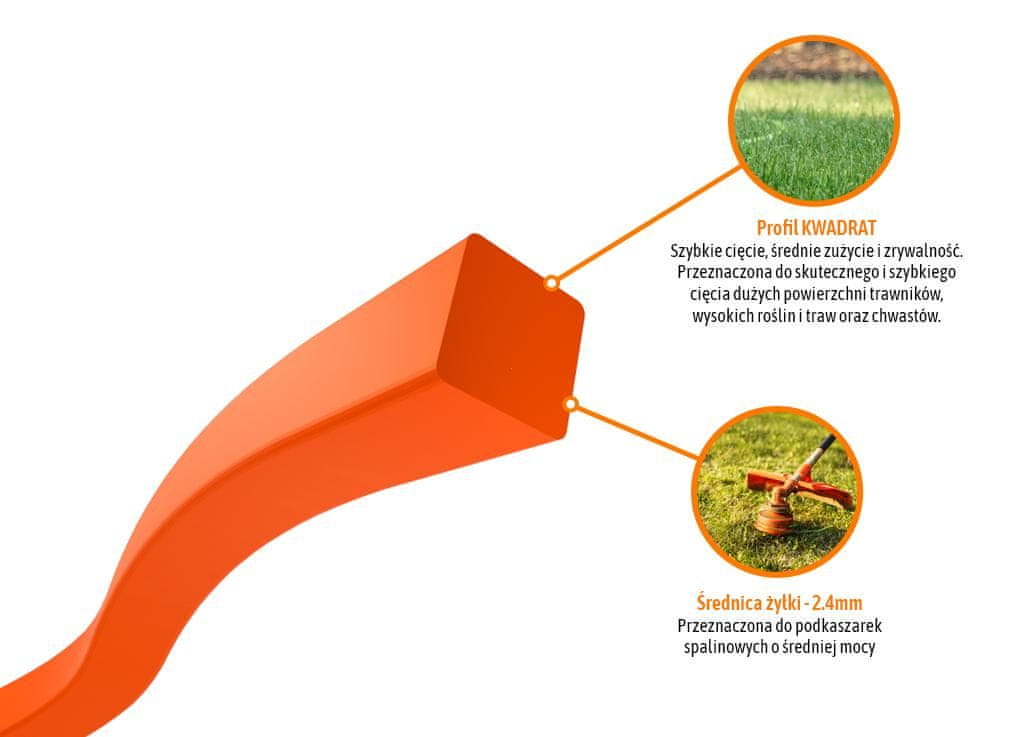 Nitka za prirezovanje TEGER / Kvadratna / 2,4 mm / 70 m / Zasnovana za trimerje in motorne kose, je ta nitka še bolj vzdržljiva, dolgotrajna in odporna na raztezanje. Ponaša se z odlično trdnostjo, zaradi česar je učinkovitejši od standardnih linij. Njegov optimalen presek zagotavlja nemoteno in učinkovito delovanje, material, uporabljen pri izdelavi, pa je vzdržljiv, močan in odporen na obrabo. Prečni prerez zagotavlja optimalno delovanje kosilnice med košnjo.