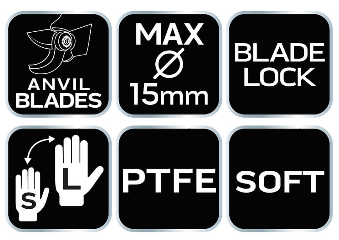 185 mm obrezovalnik z nakovalom, razpon do 15 mm, nastavljiv razmik 15–201 podjetja NEO TOOLS je enoročno orodje, opremljeno z nastavljivim razmikom rezil, ki omogoča personalizacijo. Orodje ima tudi ergonomski ročaj z mehkimi elementi in varnostno ključavnico, ki se aktivira z enim samim gumbom. Rezilo nakovala je zasnovano za trd, suh les. Za večje udobje uporabe so prekrite s premazom proti prijemanju. S tem obrezovalnikom lahko obrežete občutljive veje, poganjke, grme, rože in zelišča. Priporočamo ga tako profesionalcem kot ljubiteljem vrtnarjenja.