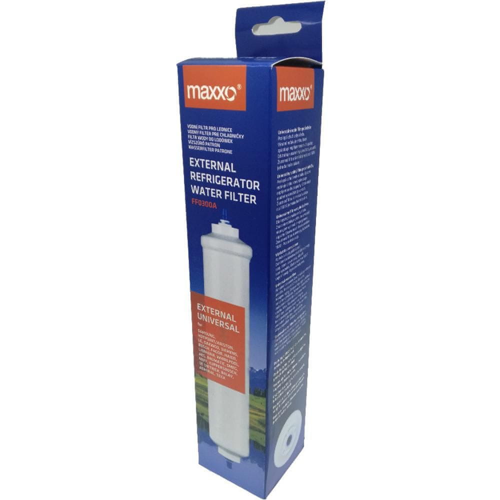 Maxxo zunanji univerzalni vodni filter za hladilnike FF0300A Za vse hladilnike, ki imajo vodni filter, nameščen zunaj hladilnika na vstopu vode Filter ima certifikat NSF42 WQA Filter ima certifikat brez svinca NSF372 WQA Blok filter z aktivnim ogljem ima certifikat WQA NSF42 Komponente filtra imajo certifikat NSF42 NSF Aktivno oglje ima certifikat NSF – NSF51 / NSF61 V skladu z evropsko direktivo 1935/2004 / EEG Aktivno oglje je izdelano iz naravne kokosove smole Filter je UV steriliziran Kakovost filtra je enaka kot pri filtru blagovne znamke Odstranjuje klor, ki povzroča neprijeten okus in vonj Ne odstranjuje koristnih mineralov iz vode Vsi filtri so certificirani za pravilno namestitev in delovanje z najnovejšimi spremembami proizvajalca originalne opreme Proizvedeni v obratu ISO9001