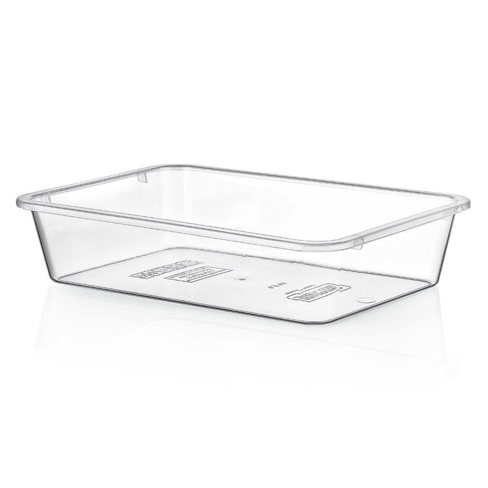 Posoda za shranjevanje hrane v kuhinji. Idealna kot organizator za hladilnik, še posebej za shranjevanje sadja in zelenjave. Prozorna zasnova omogoča enostaven pregled vsebine posode. Enostavna za čiščenje in odporna na nizke in visoke temperature. Posoda nima pokrova. Uporabna v vsakem domu. Izdelana po evropskih standardih.