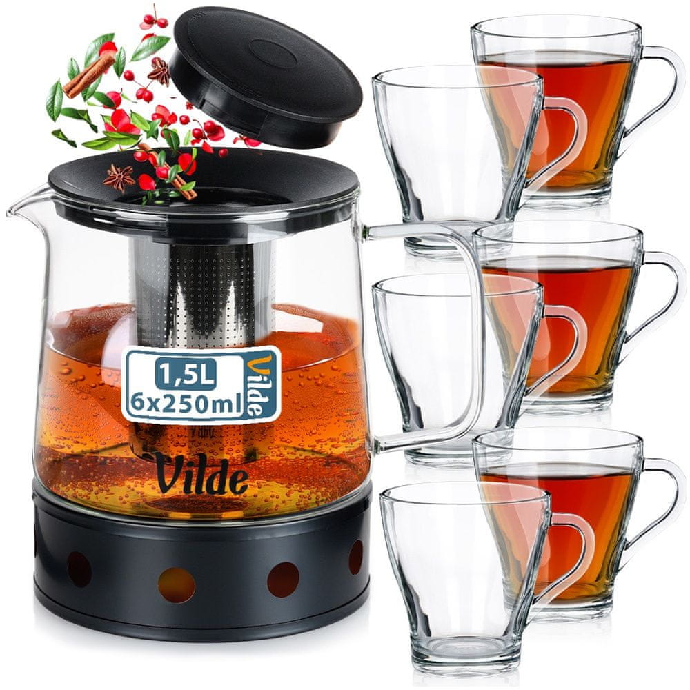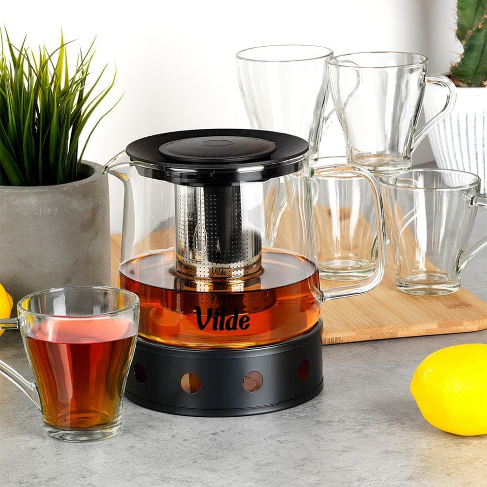 Praktičen komplet za kuhanje in serviranje čaja, ki ga sestavljajo vrč z infuzerjem, kovinski grelnik za čaj in šest kozarcev. Omogoča vam vzdrževanje temperature napitka in njegovo elegantno postrežbo. Popoln za vsakodnevno uporabo ali kot darilo za ljubitelje čaja. Originalni izdelek Vilde. Izdelano v skladu z evropskimi standardi.