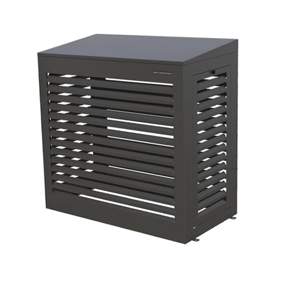 TS-COVER BOX, samostoječa zaščita za zunanjo enoto s 5° nagnjeno streho dimenzij 1100 × 1050 × 600 mm. Celoten opis