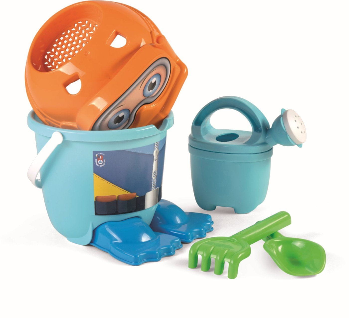 7-delni set za pesek, izdelan iz visokokakovostne plastike v Italiji. Vključuje: vedro, sito z glavo potapljača, 2 bitja v obliki potapljaške plavuti, čajnik, zajemalko in grabljice. Vedro: premer 18 cm. Komplet: višina 33 cm, teža 0,371 kg. Priporočena starost od 12 mesecev.